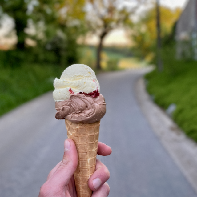 Onze kaart is eenvoudig van opzet maar rijk van smaak, omdat elk ingrediënt zijn eigen lokaal of familiaal verhaal heeft. Het ijs draaien we zelf, van de volle melk van onze eigen koeien. De yoghurt bereiden we dagelijks, de boter karnen we met eigen room, de pannenkoeken bakken we met verse melk in eigen roomboter. De eieren komen van de neef van Ria, want ook buiten onze eigen stal houden we de keten kort en familiaal. Zelfs de cappuccino begint bij onze koeien.