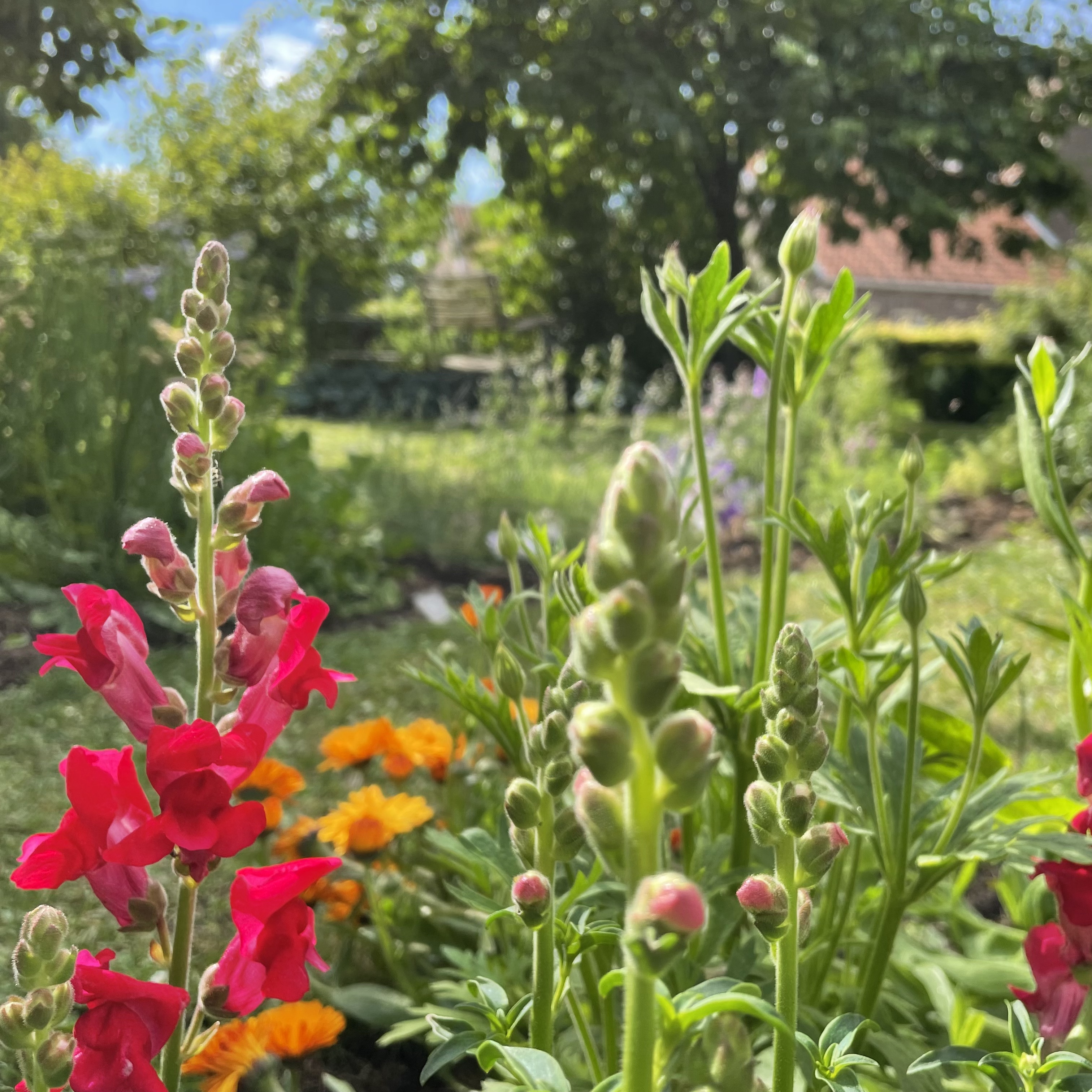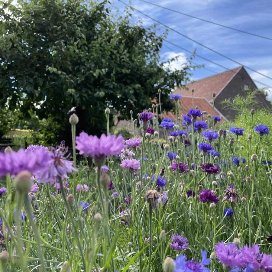 Recht tegenover de boerderij ligt onze bloementuin van 600m², een weelderige verzameling van vaste planten, kruiden, kleinfruit, voorjaarsbloeiers en zomerbloeiers. Bloesemtakken, hyacinten, tulpen, narcissen, dahlia's, elk seizoen schrijft zijn eigen verhaal in bloemen, geuren en kleuren.